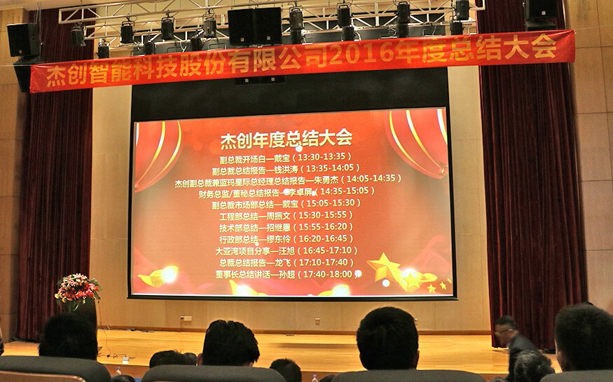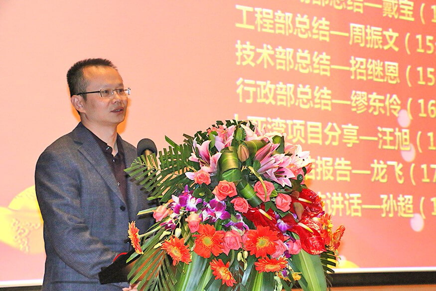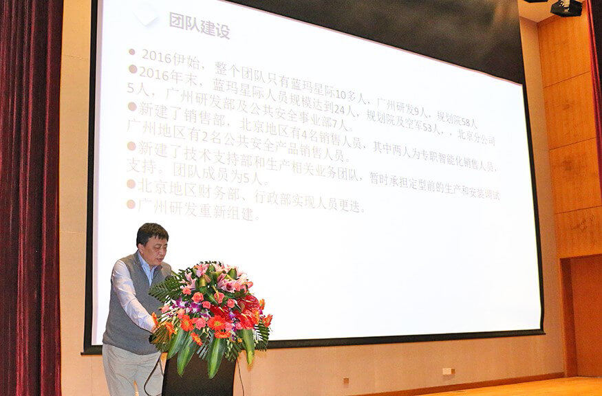 总结大会上,在公司副总裁戴宝先生激情洋溢的开场白后,副总裁钱洪涛先生、银河集团智能董事兼蓝玛星际总经理朱勇杰先生、财务总监兼董秘李卓屏女士、副总裁戴宝先生、工程部总监周振文先生、技术部总监招继恩先生、行政部总监缪东伶女士、工程部副总监汪旭先生、总裁龙飞先生先后登台,分别做了2016年度工作总结。