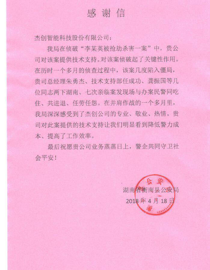 近日,湖南省衡南公安局发来感谢函,对银河集团智能在近期协助侦破“李某英被抢劫杀害一案”表示感谢,目前相关犯罪嫌疑人已被依法刑事拘留,案件正在进一步侦办中。